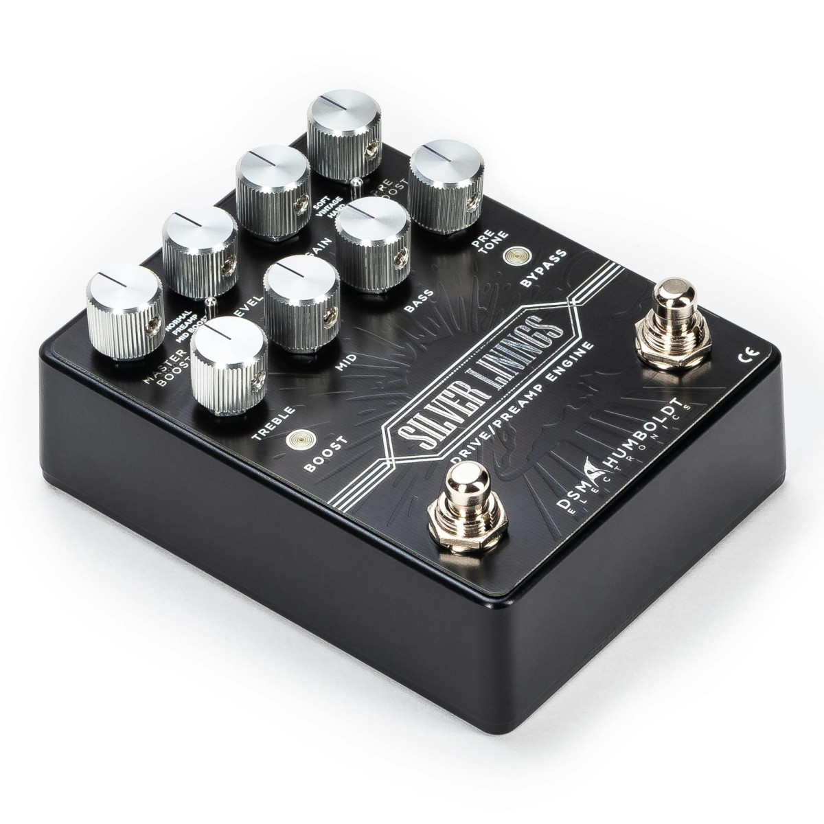 The Silver Linings boasts a dual boost function, with pre and master boost levels. Use the Pre Boost for extra gain and compression, and the Master Boost for higher output levels. Using them together, you can place your solos in front of the mix with extra gain, like having a second channel. The Master boost also works independently if the drive is bypassed, allowing to use it to boost your clean signal.