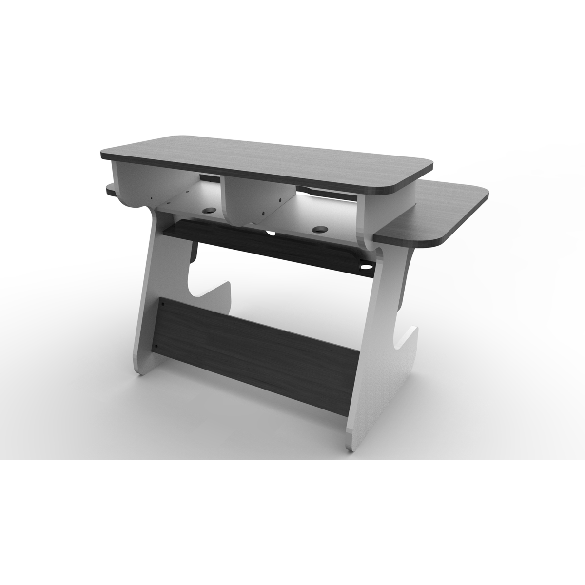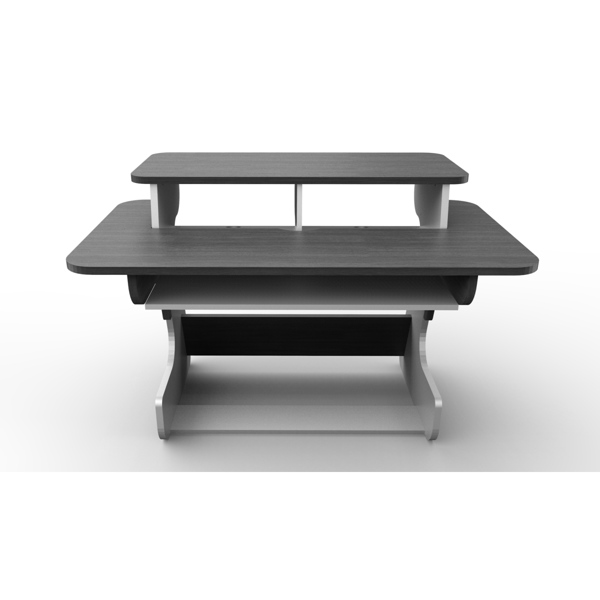 Combines wide desktop, generous key drawer and 8 rack spaces to top it off. You have space for screens or speakers atop the racks and there is a flip flap cable management in the back.