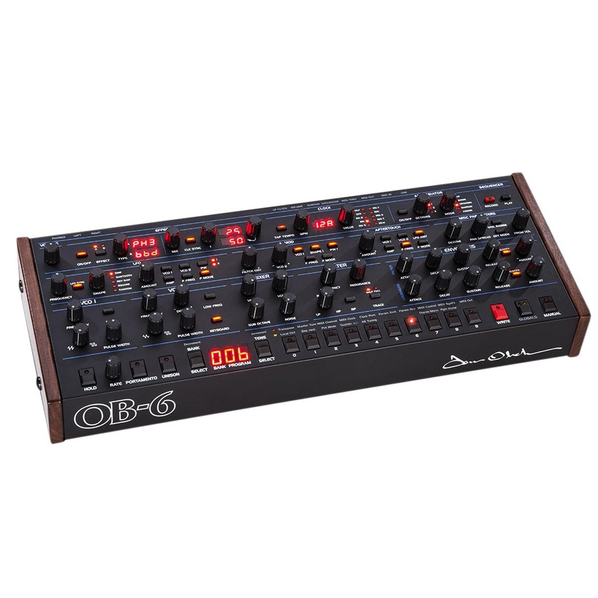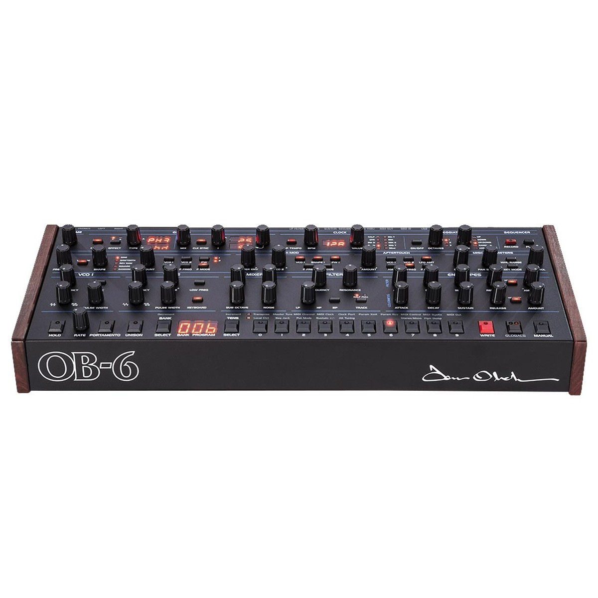 The knob-per-function front panel puts virtually all OB-6 functions at your fingertips. Included are 500 permanent factory programs and 500 rewritable user programs. Turning on the Manual button enables live panel mode, in which the sound of the OB-6 switches to its current front panel settings. In this state, what you see is what you hear.