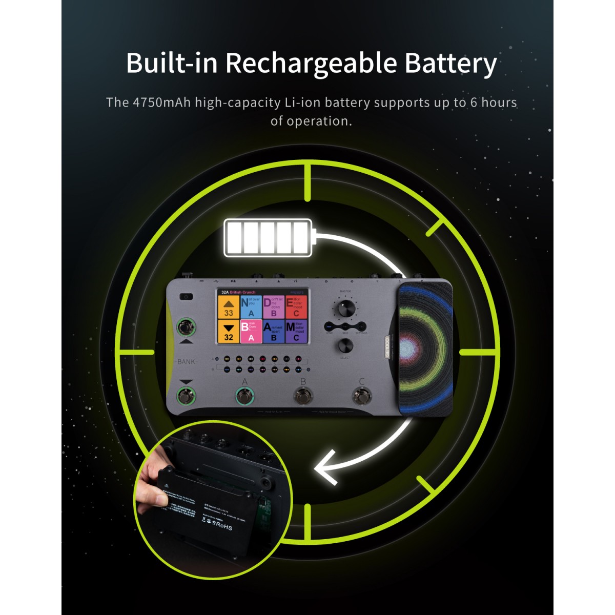 This level of flexibility is matched by the pedal’s audio routing solutions, which feature Bluetooth playback, USB audio interfacing, serial and parallel TRS stereo FX LOOP compatibility,and industry-standard input and output ports.