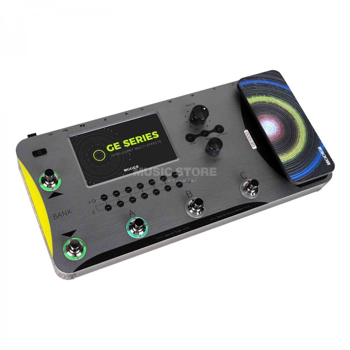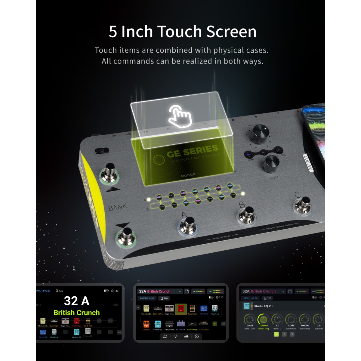 MOOER has always excelled at providing innovative UI experiences, and the GE1000 is set to continue this trend. The pedal features a 5-inch high-quality colored touch screen designed for intuitive multi-effect workflows while keeping some fan favorites from previous GE pedals. These include the signature MOOER multi-purpose control dials, buttons, and a quick-access expression pedal.