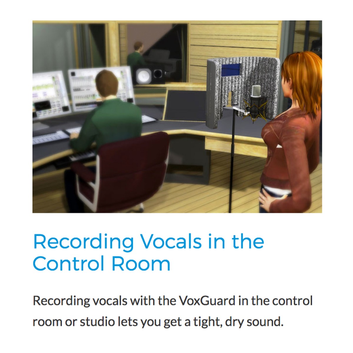 The VoxGuard is a nearfield vocal screen designed to reduce the ambiance around a microphone when recording. This allows the voice to be captured while eliminating the echo and reverb, allowing the engineer to reintroduce the desired effects during post production.