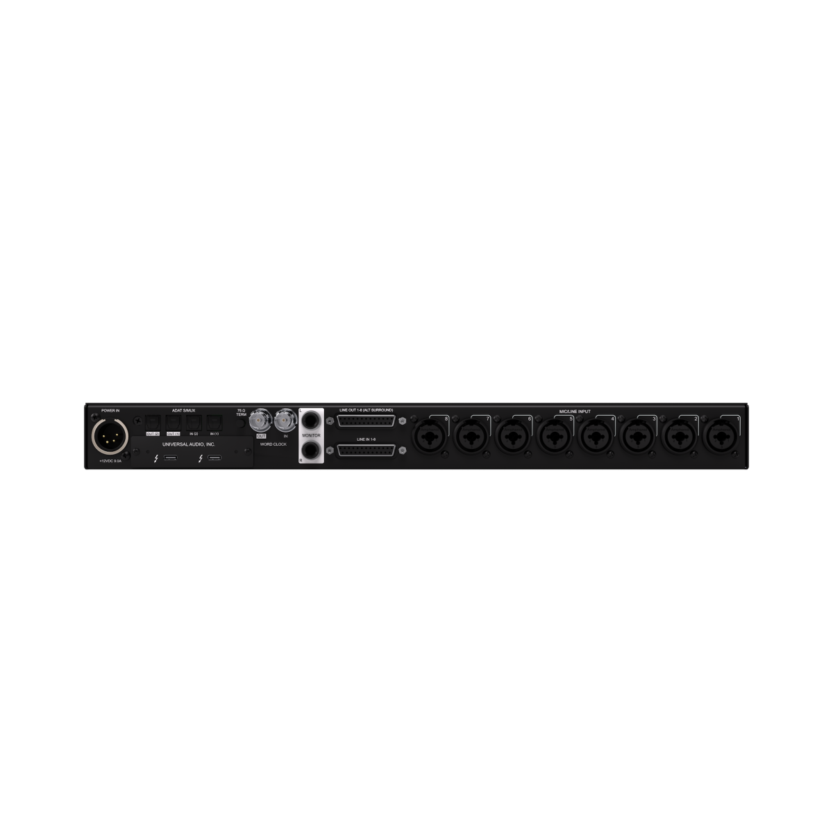 - Eight UnisonTM mic preamps, two Hi-Z instrument inputs, DB-25 input (line 1-8), two optical Toslink I/O (ADAT S/MUX or S/PDIF), word clock I/O (BNC)